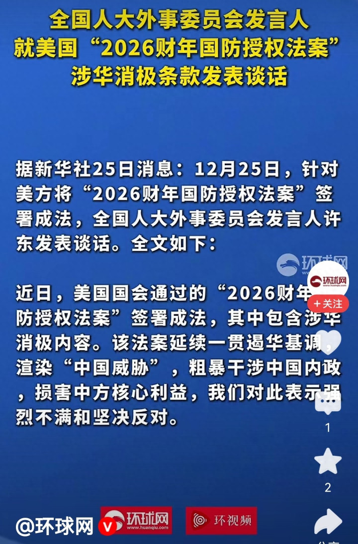 作者声明:信息来源@2025年12月25日新华社:全国人大外事委员会就美国“2026财年国防授权法案〞涉华消极条款发表谈话聚赢盘