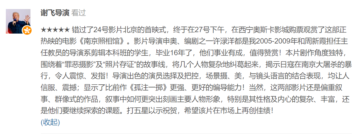 先说《南京照相馆》,谢飞导演打出五星,给了极高的评价。但重点是“当然”两个字后面的转折,他认为《南京照相馆》和《孤注一掷》一样偏重叙事、群像式的作品,那句“叙事中如何更突出刻画人物形象,特别是其性格及内心的复杂、丰富,还是他们要继续探索的课题”而打五星有“以示祝贺”的成分,很显然“如何”后面的部分,其实就是在点出电影的不足。